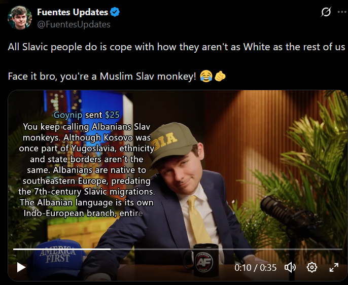 kek, we have the first response. ALBANIA #1 NICK IS MEXICAN NOT WHITE SKANDEBERG X SO NICK FUENTES NOT MUSLIM TODAY!https://x.com/UE_Clips/status/2025806922436489652we have a war balk, this white blond albo diaspora waving his proud albanian flag claims whiter than our guy Nicholas