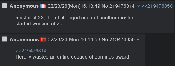 >>219478033plebs need more brothe fuck you think they're at work in the first place>>219478091he literally wasted 10 years of prime earning and compounding potential bro, and I'm there's 0 jobs in the EU that justify reskilling/training for that long with the salaries herehe's exactly the type of person that goes online and says boohoo life is so hard and unfair am I right bros without mentioning he wasted an entire decade of it playing around in adult daycare while normal people were working