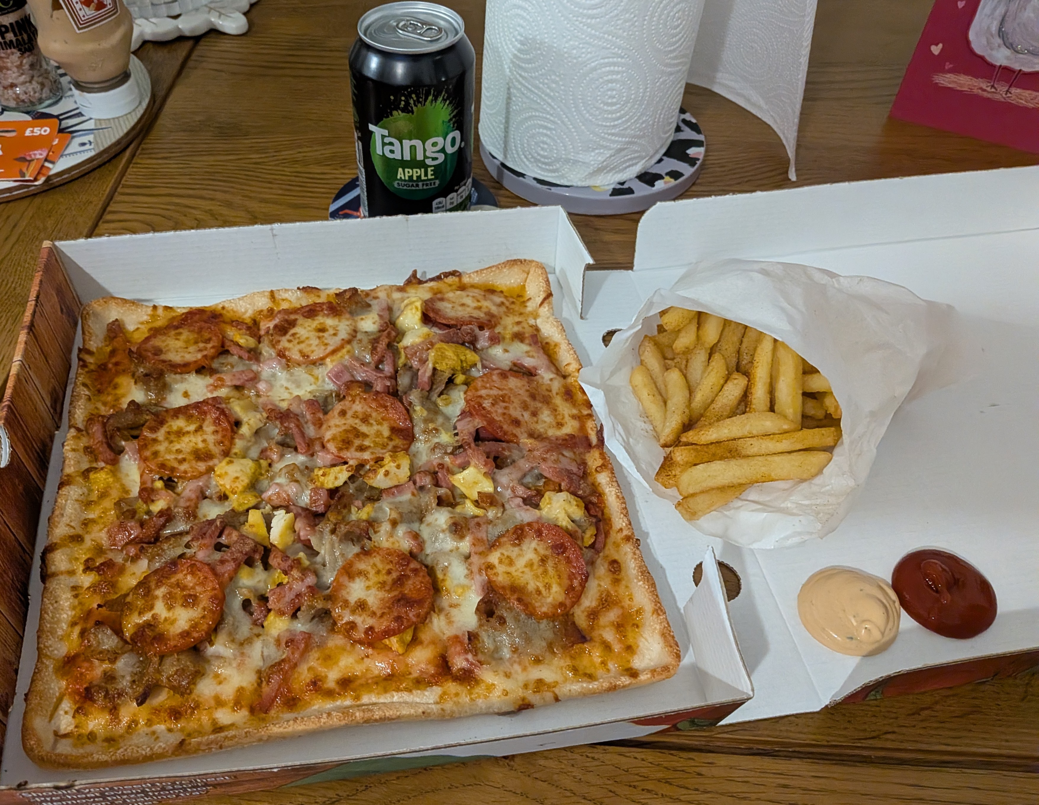 Me Din DinsFinest Bossman Meat Feast PizzaChip spice chipsTango AppleBosh