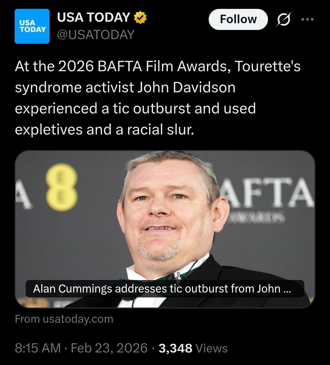 f a Black man with Tourette's yelled a homophobic slur as two white gay men won awards, he wouldn't be given this same grace. In fact, they probably would've told him he couldn't come to the ceremony off rip. just an observation
