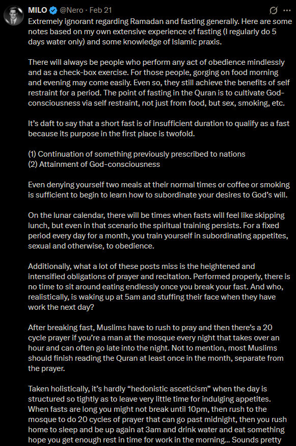 >>219487809You should have posted وَمَن كَانَ مَرِيضًا أَوۡ عَلَىٰ سَفَرٖ فَعِدَّةٞ مِّنۡ أَيَّامٍ أُخَرَۗhe would learn and it would've been more productive >>219488410I just assume other muslims are kufar by default until proven otherwise but treat them as muslims, i shouldn't do this but 99% of time im right because normies are dumb af, so im cynical takfiri
