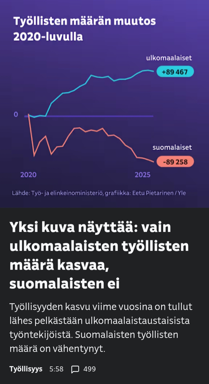 Nyt on aivan helvetin huonoa keskustelua täällä.Mitä tässä on tapahtunut: Suomalaisten määrä työelämässä vähenee, kun buumerit jää eläkkeelle. Ulkomailta palkataan työntekijöitä, joten ulkomaalaisten työllisten absoluuttinen lukumäärä kasvaa. Ulkomailta otetaan ihmisiä humanitaarisin perustein, mutta näillä ei ole edellytyksiä työmarkkinoille, joten ulkomaalaisten työttömienkin määrä kasvaa.Mitä tässä ei ole tapahtunut: Ulkomaiset ovat työllistyneet hyvin / huonosti. Eli "loisivat" / "vievät meidän työt". Ulkomaalaiset ovat rikollisia / pyhimyksiä. Suomalaiset ovat ahkeria / laiskoja verrattuna ulkomaalaisiin.Näistä lukemista ei voida päätellä yhtään mitään yhtään mistään.