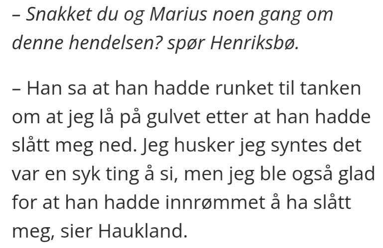 >alle forklaringene begynner med at Nora Haukland slo Marius først