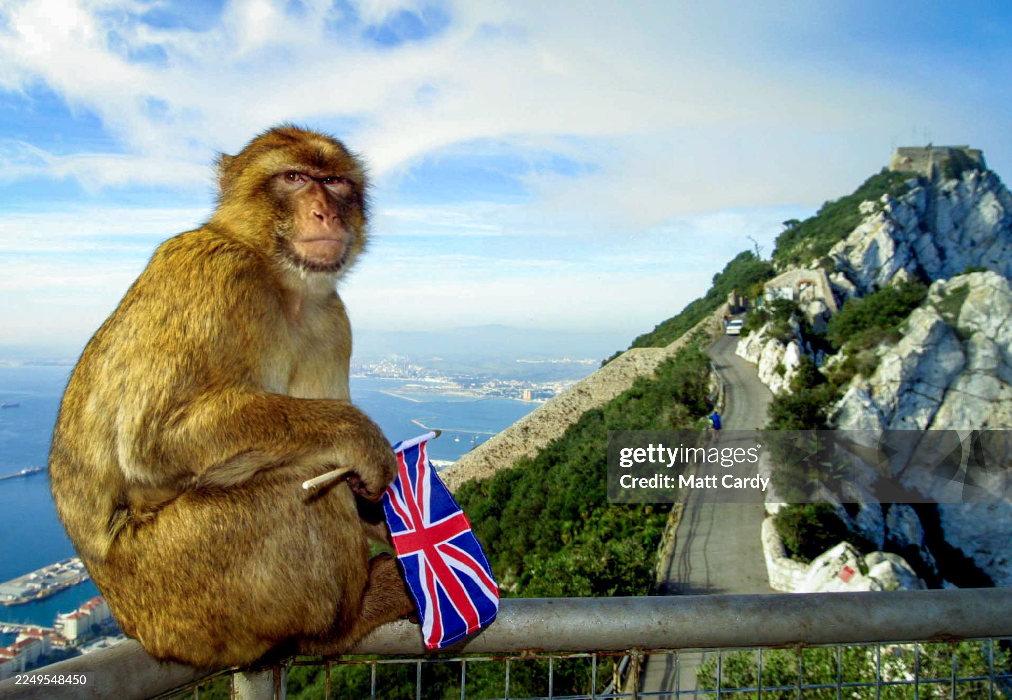 A Barbary macaque monkey holds a British Union Jack flag taken from a tourist as they sit on a fence at the Gibraltar Cable Car. A common held local belief is that if the monkeys were to ever leave Gibraltar, the territory will no longer be under British control (2002)