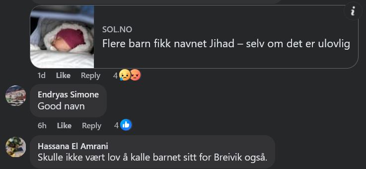 >>219558808det kommentarfeltet var ca 100 pakkiser som sa at det var et fint navn, og forklarte på gebrokken norsk hvorfor. et par norske menn som sa det var et drittnavn og noen norske kvinner som var enige om at det var et fint og vakkert navn.dessuten kan visstnok nordmenn kalle barnet sitt for breivik? og derfor var det greit