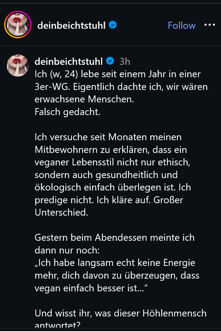 ch lebe seit einem Jahr in einer 3er-WG. Eigentlich dachte ich, wir wären erwachsene Menschen.Falsch gedacht.Ich versuche seit Monaten meinen Mitbewohnern zu erklären, dass ein veganer Lebensstil nicht nur ethisch, sondern auch gesundheitlich und ökologisch einfach überlegen ist. Ich predige nicht. Ich kläre auf. Großer Unterschied.Gestern beim Abendessen meinte ich dann nur noch:„Ich habe langsam echt keine Energie mehr, dich davon zu überzeugen, dass vegan einfach besser ist…“Und wisst ihr, was dieser Höhlenmensch antwortet?„Natürlich hast du keine Energie mehr. Du isst ja auch kein Fleisch.“Alle haben gelacht.ICH stand da wie der Clown.Sorry, aber dieses „Haha Veganer sind schwach“-Narrativ ist so 2012.Während ich mir wenigstens Gedanken über meinen Impact mache, inhalieren die sich ihre Discounter-Steaks und denken, sie wären Alphatiere.