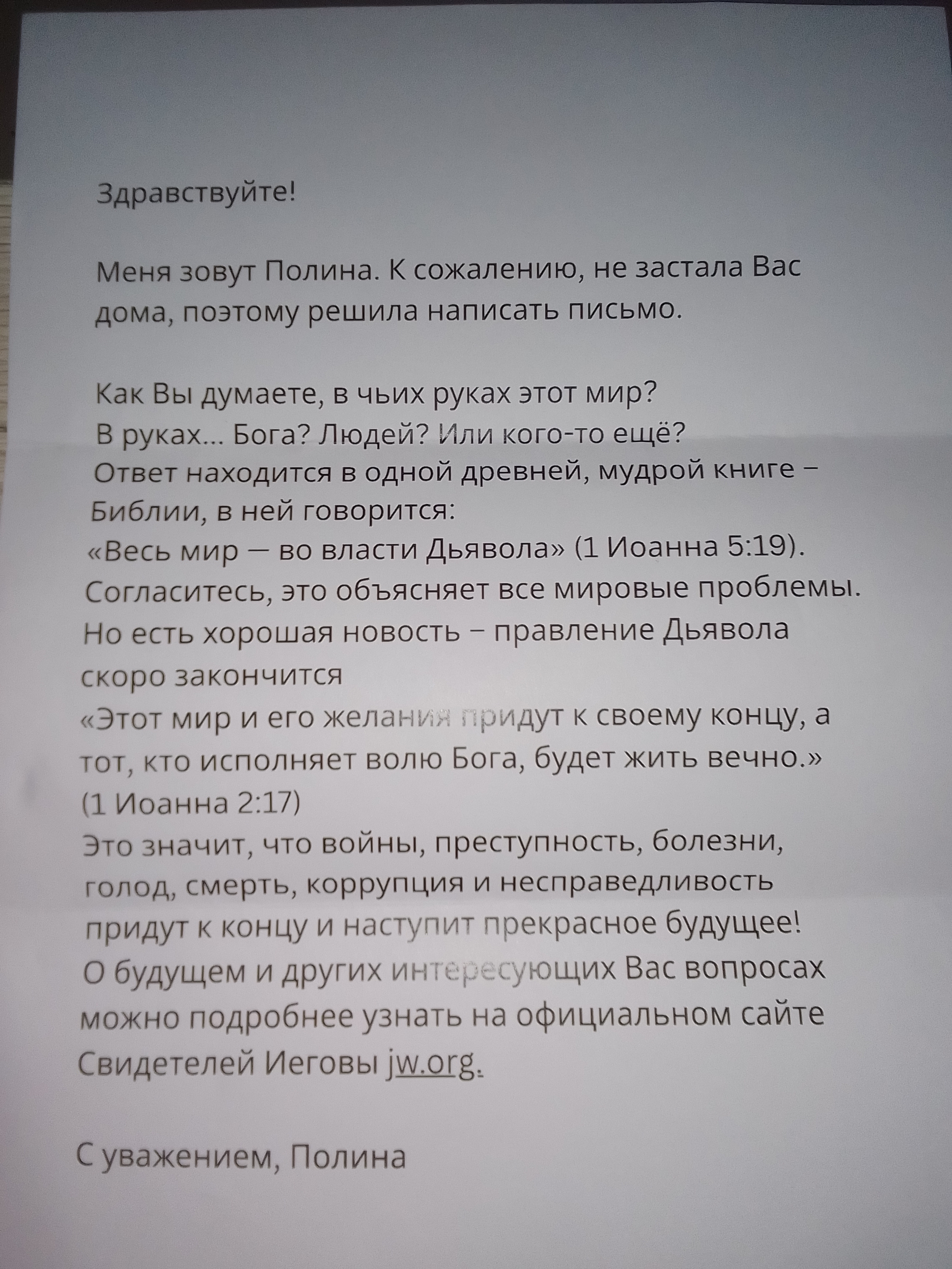 äint gönna lie : im kinda spooked rn in m1 postkasten lag 1 briefumschlag ohne beschriftung. darin 1 brief von polina. die rothaarige Frau welche damals immer regelmäßig an m1 tür klingelte + mich schlussendlich zu den Zeugen Jehovas lockte jener Brief von ihr frei übersetzt (das essentielle) ="was glaubt ihr in wessen händen diese welt ist ? in den händen...Gottes ? der menschen ? oder sonst wem ? die antwort ist in der bibel "die ganze welt ist in der hand des teufels. Iona (johannes ?) 5:19(...)aber es gibt gute neuigkeite - die Herrschaft des Teufels endet bald. "diese welt neigt sich ihrem ende zu, derjenich der den Willen Gottes ausführt wird geretet, die herrschaft des teufels endet bald"iona / johannes 2:17erfahren sie mehr auf jw.org (zeugen jehovas website) vibes jetzt grade auf unironisch : https://www.youtube.com/watch?v=gPiYPthHOGc&t=58dieses life ist 1 Silent Hill Movie in the making heh
