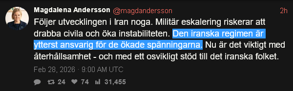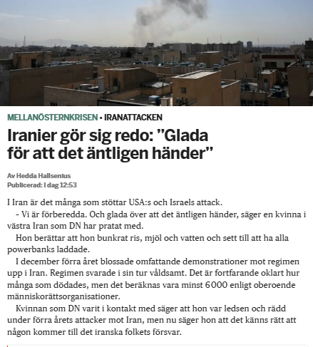 Antalet civila som dog i protesterna i Iran tycks öka varje gång jag hör talas om det. Först var det 20 000, sen var det 30 000, sen var det 38 000. Nu är det tydligen 42 000.Och justja, det är detta som är anledningen till att USA/Israel nu måste bomba Iran. Kriget i Irak 2003 resulterade i 200,000+ döda civila.