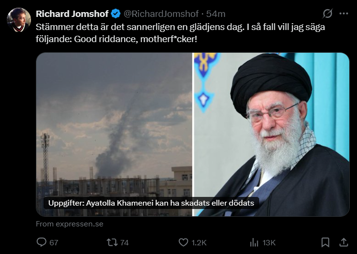 >US official confirms to Fox that US believes Khamenei and 5-10 top Iranian leaders killed in initial Israeli strike on compound; agree with Israel’s intelligence assessment.Ayatollorna är dumma i huvudet