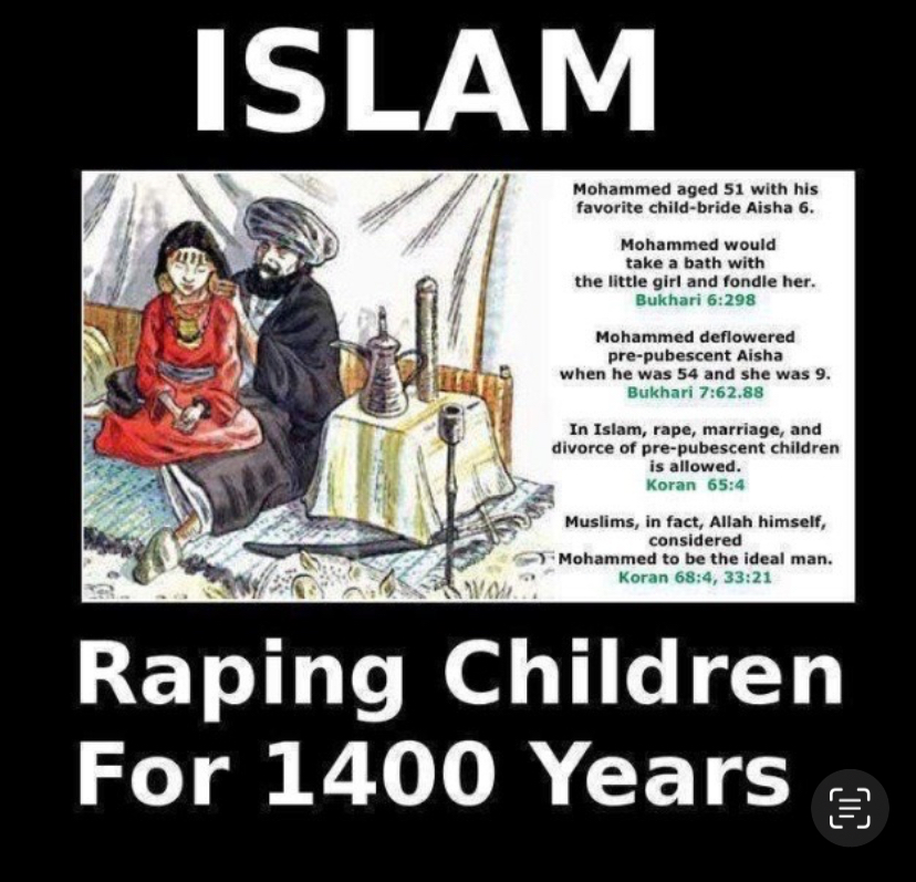 >>219657636>>219659837>>219660001Muhammad (piss be upon him) was a greedy, psychopathic pedophile warlord and liar and false prophet who fooled an ignorant people and then enslaved the rest to acquire riches, power, and sex slaves.> "Narrated 'Aisha: that the Prophet married her when she was six years old and he consummated his marriage when she was nine years old, and then she remained with him for nine years (i.e., till his death)."- Sahih al-Bukhari 5134 (and similarly in Sahih Muslim)> Aisha reported: "The Messenger of Allah (ﷺ) married me when I was six years old, and he mufākhadhah (thigh-contacted/embraced) me and kissed me [before the age of 9], but he did not enter me."- Sunan Abu Dawood 2123https://youtube.com/watch?v=awIB-GYQBW4