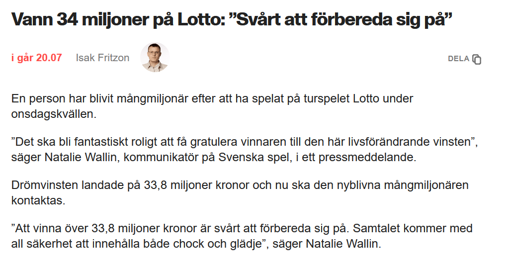 >dkn missat fyra samtal >ringer igen precis innan 22:00 >okänt nummer >svarar >är Svenska Spel >tydligen har man vunnit storvinsten >imorgon måste jag ringa banken och förvarna så det inte flaggas Tydligen är jag rik nu.