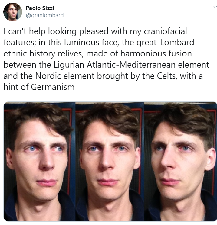 >I do not claim to be 100% Teuton. My dark hair and eyes forbid me that honour. But when I reflect on the fact that hair and eyes are the first things to be chang’d in a blond race upon the least infusion of southern blood, and gold-and-blue scheme being very unstable and liable to revert to the more primitive and deeply hereditary brown or black scheme; I am content to survey my ample height and pallid complexion ( bleach’d by the deep Saxon forests and Scandinavian snows) and pronounce myself 99.9% Teutonick. This supposition is borne out by my coarse features–the rough-hewn physiognomy of a Viking warrior–and by my enthusiastick response to warlike and imperious stimuli>Did we not pour down out of our native forests and reclaim a degenerate Europe where civilisation, under effete Mediterranean dregs, was dying out? My God! The very name of France comes from our huge yellow-bearded Franks, and in Spain they call a gentleman a hidalgo -- hijo del goda -- son of the Goth -- the huge blue-eyed, conquering Nordick! Fancy a world without Clovis -- or its Charlemagne -- the Teuton Karlomann, and the Vikings and the Norsemen...ho for the frozen seas and the epick of sleet and blood, strange lands and far wonders! Greenland, Iceland, Normandy, England, Sicily -- the world was ours, and the mountainous billows heaved with the Cyclopean rhythm of our barbarick chants and shouts of mastery! Art? By Woden, were not our deeds and battles, our victories and empires, all parts of a poem more wonderful then aught which Homer cou'd strike from a Grecian lyre?