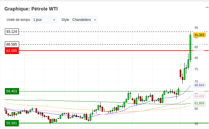 >>219762465Le baril au dessus de 90$ c'est le prix à la pompe au dessus de 2 euros.Je pensais que ça allait se calmer car la hausse des deux jours précédent était limitée, la tendance prend un autre tournure avec ce genre d'augmentation conséquente, il est possible que demain ça tape les 100$ le baril.Le poisson va augmenter, les produits issus de l'agriculture probablement aussi de 15 à 20%.Comme l'état va rentrer un fric monstre le gouvernement ne va absolument rien faire pour absorber cette hausse, au contraire.Le prix de l'électricité en Europe est influencé sur le prix du gaz, grâce à nos amis allemands, le gaz augmente aussi pas mal mais on est pas aux niveaux de 2022, par contre la hausse pourrait être définitive.