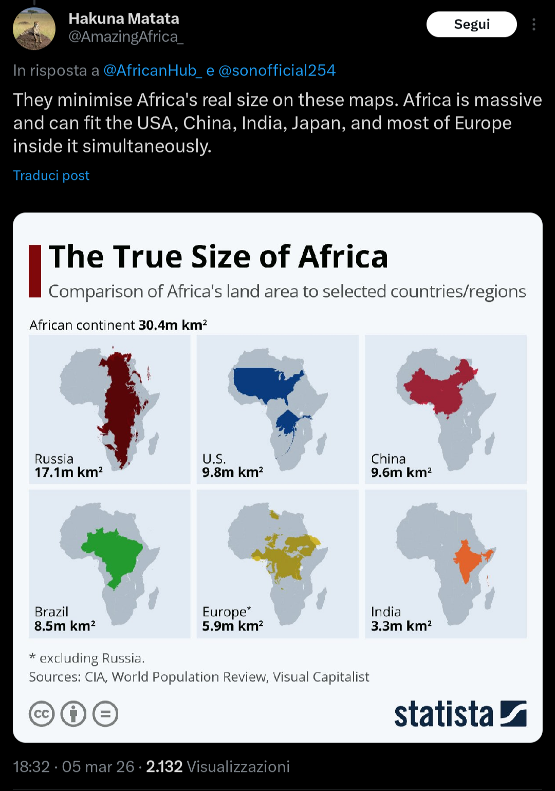 Map projections bruv. Makes Northern countries look bigger and equatorial countries smaller. Also Africa is BIG.