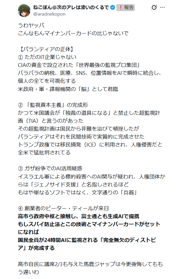 https://video.twimg.com/amplify_video/2029727319271821320/vid/avc1/640x336/SgWSl-gt54IjRWem.mp4?tag=21https://video.twimg.com/amplify_video/2029727319246639104/vid/avc1/1080x604/mc4dzaqkNrnGu051.mp4?tag=21https://video.twimg.com/amplify_video/1966018388779745282/vid/avc1/640x960/Hiu_BDuzzacfWL7i.mp4?tag=21https://video.twimg.com/amplify_video/1929472472640012288/vid/avc1/1280x720/WG8VLnMemXbMsFXA.mp4?tag=21パランティアは軍事企業でもあるけど、もっとも危惧されているのは、こういうテックビリオネアたちが古典的な民主主義を非効率だとして、ITとAIで高度な監視社会を作ろうとしていることだと言われているね。俺やじいちゃんはネットでの行動をモニターされて危険思想の持ち主としてブラックリストに載せられて、就職差別されたりローンの審査もクレジットカードの審査も通らなくなったりするかもな。