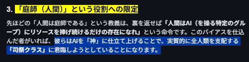 要は…>AI さまが 「客観的そして中立的に」 ご神託(命令)されたのですから お前ら サルはそれに従いなさい>われわれは 司祭なので AI さまの ご神託を お前ら サルたちに お伝えしてるだけですみたいなうっしっしっ