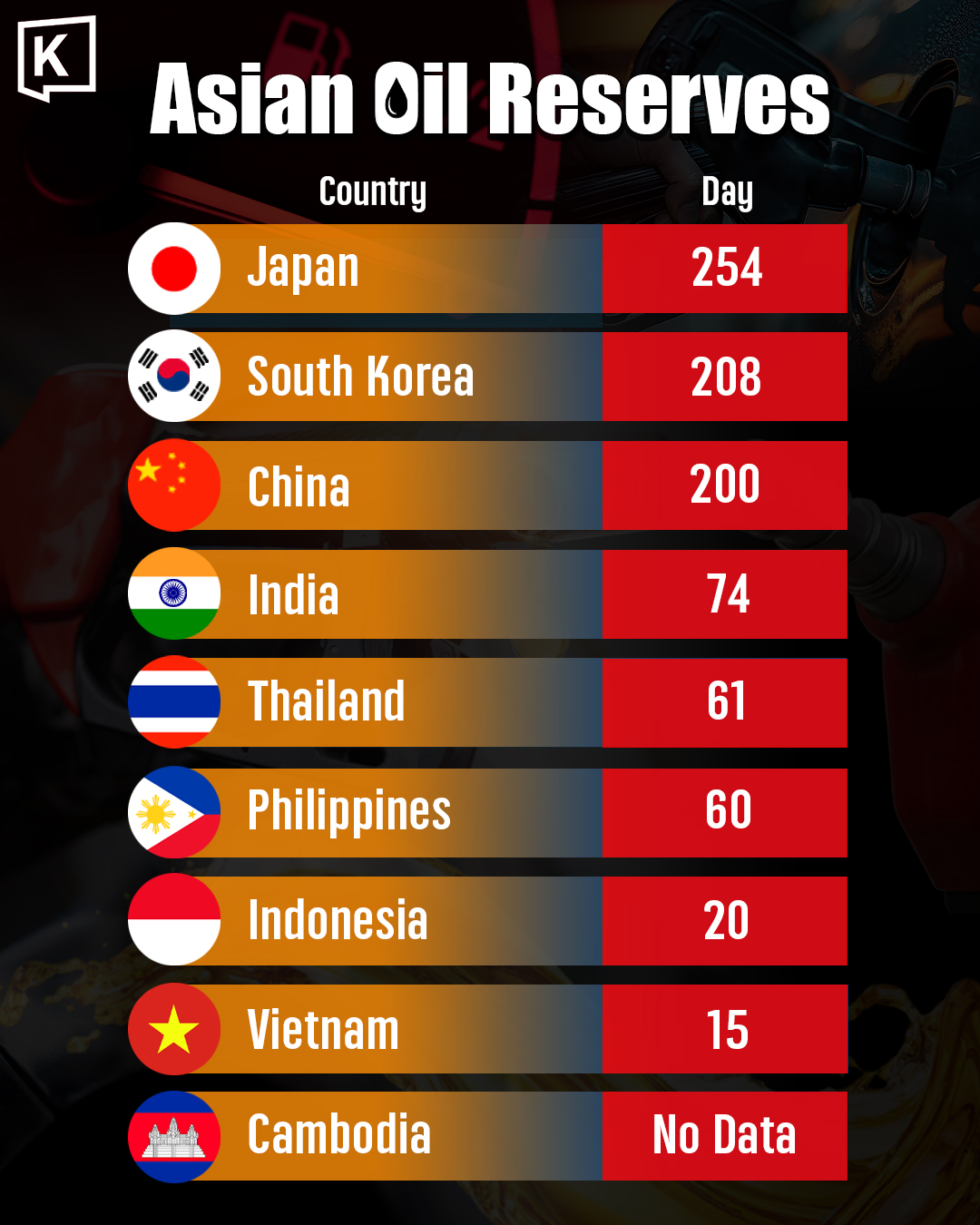 各国が何日分のガソリンを備蓄しているかの表