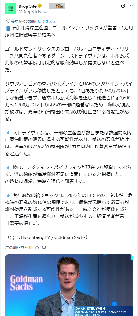 ホルムズ海峡の封鎖が続けば、一ヶ月以内に産油国の貯蔵容量の限界に達して石油ッくさくそのものが停止する予定。トランプとネタニヤフと高市がカスすぎる。