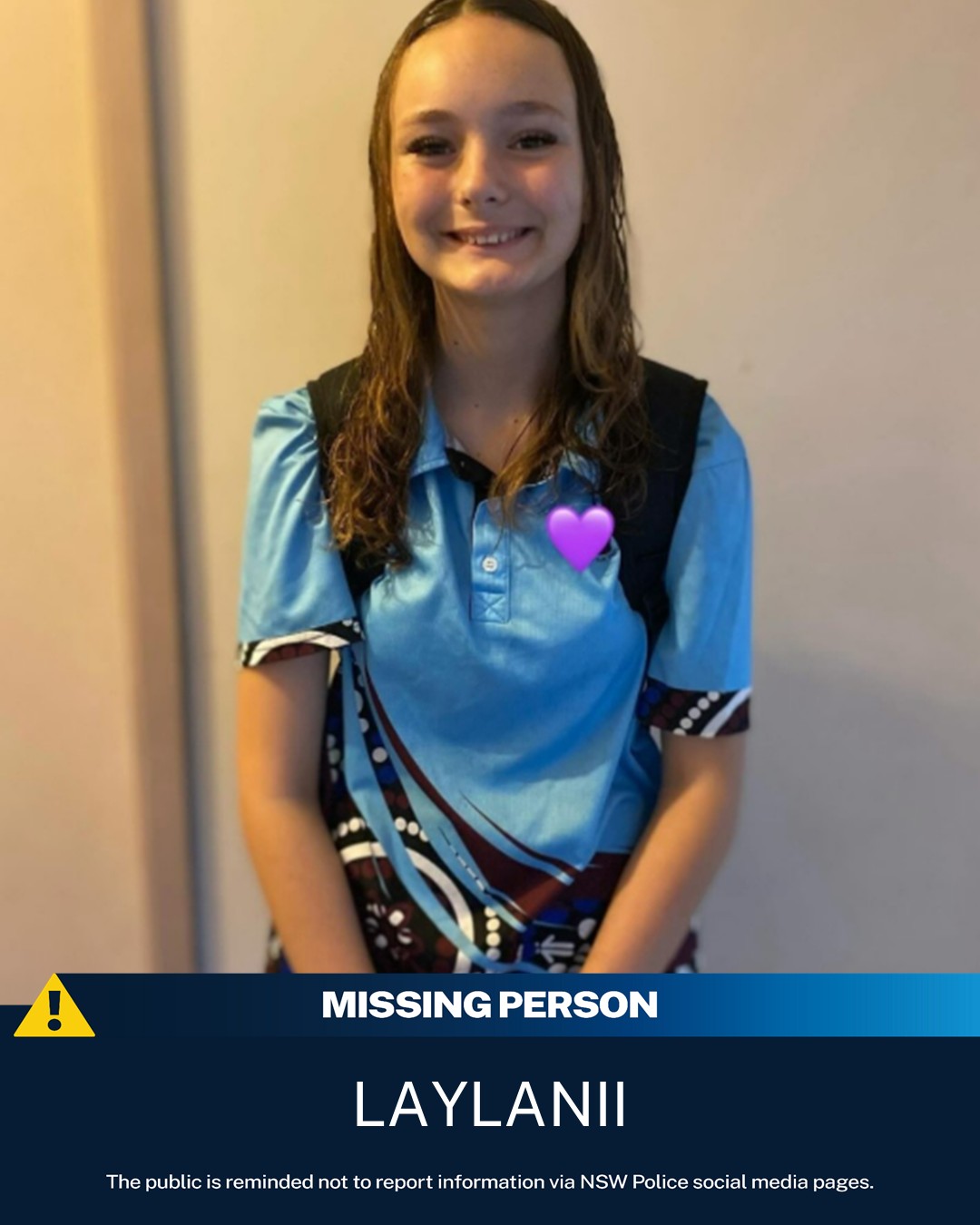 Can you help us find Laylanii?Laylanii, aged 13, was last seen in Toormina on Thursday, 5 March 2026.
