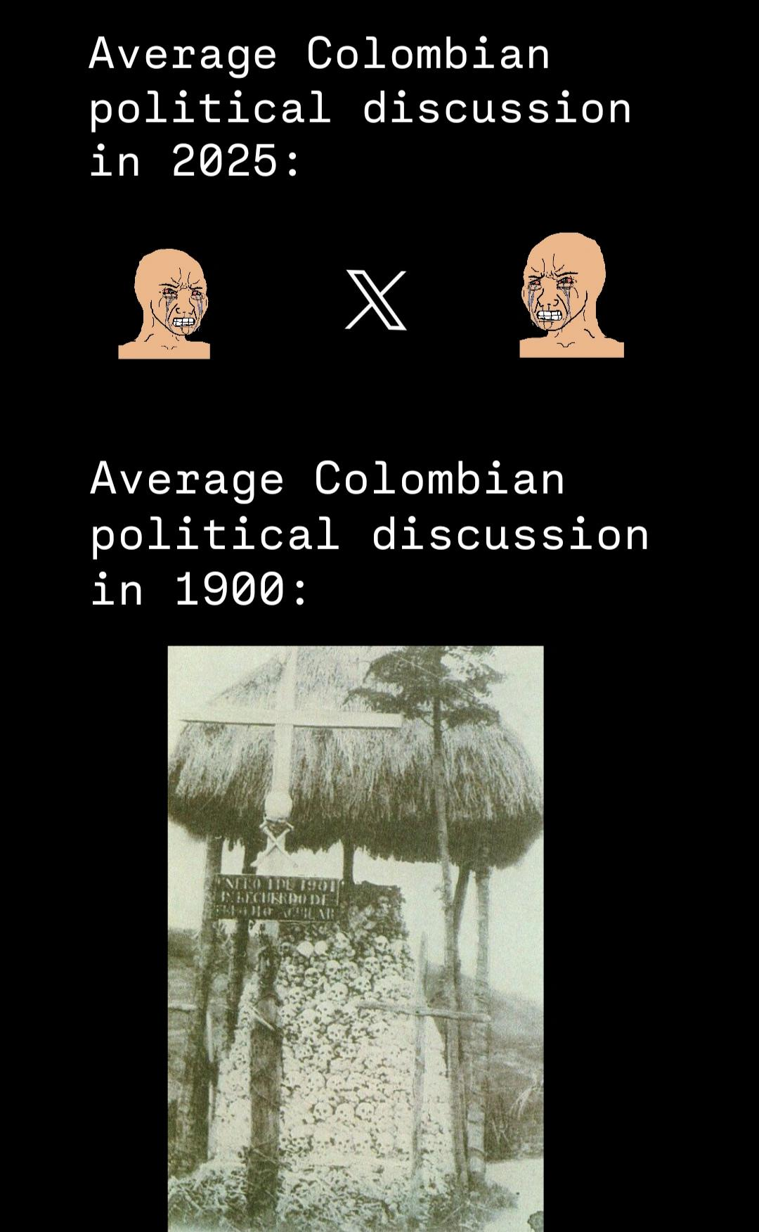 >>219758881Es referencia a la Guerra de los Mil Dias.Aca entre partidos politicos hubo la Guerra Grande.Antes se cagaban a los tiros por poder, ahora se crean vtubers y bostean en xitter.