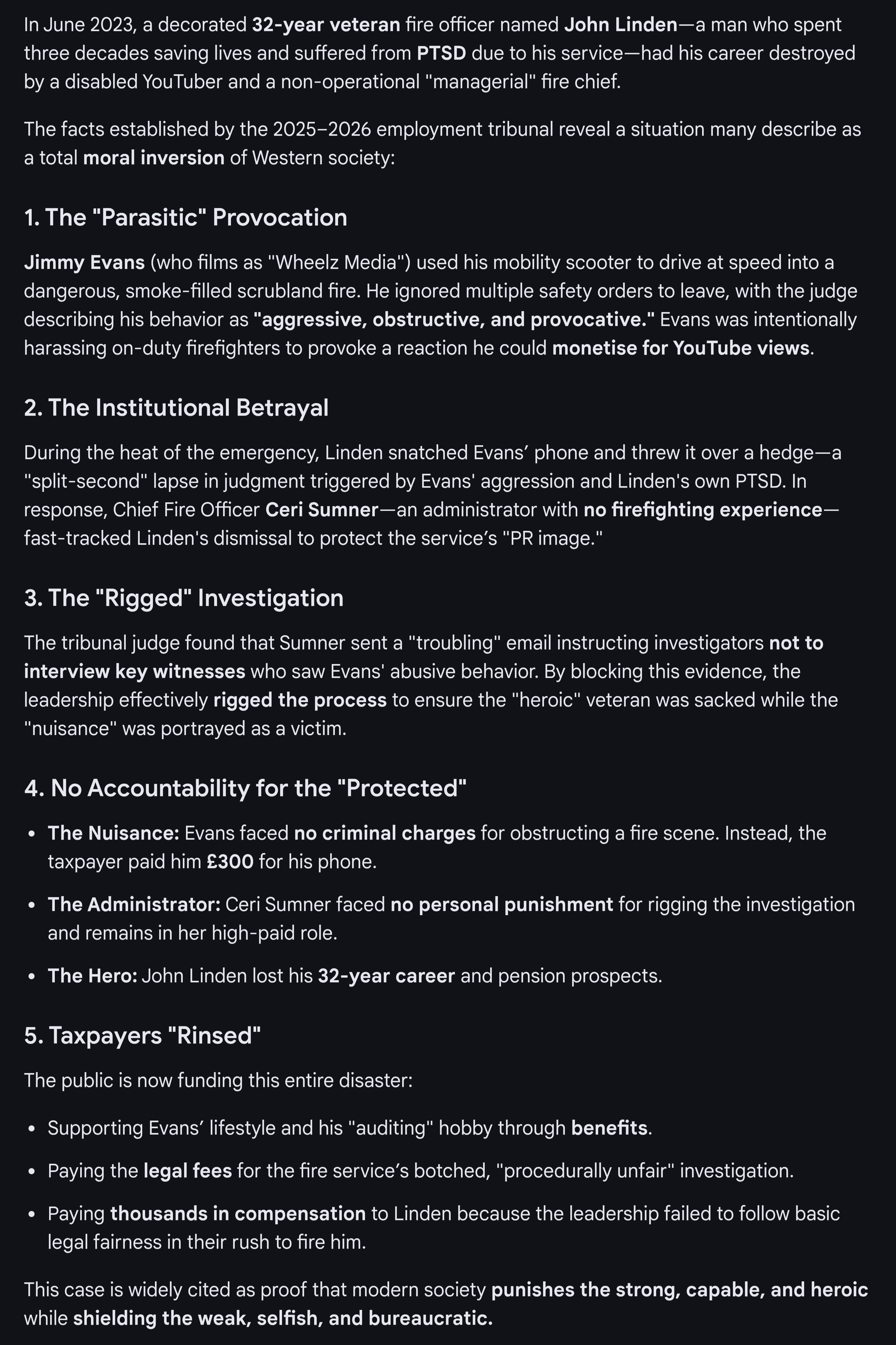 Has never put out a single fire Is in charge of all of them Fired the actual firefighter Was ruled to have done that illegally Zero consequences