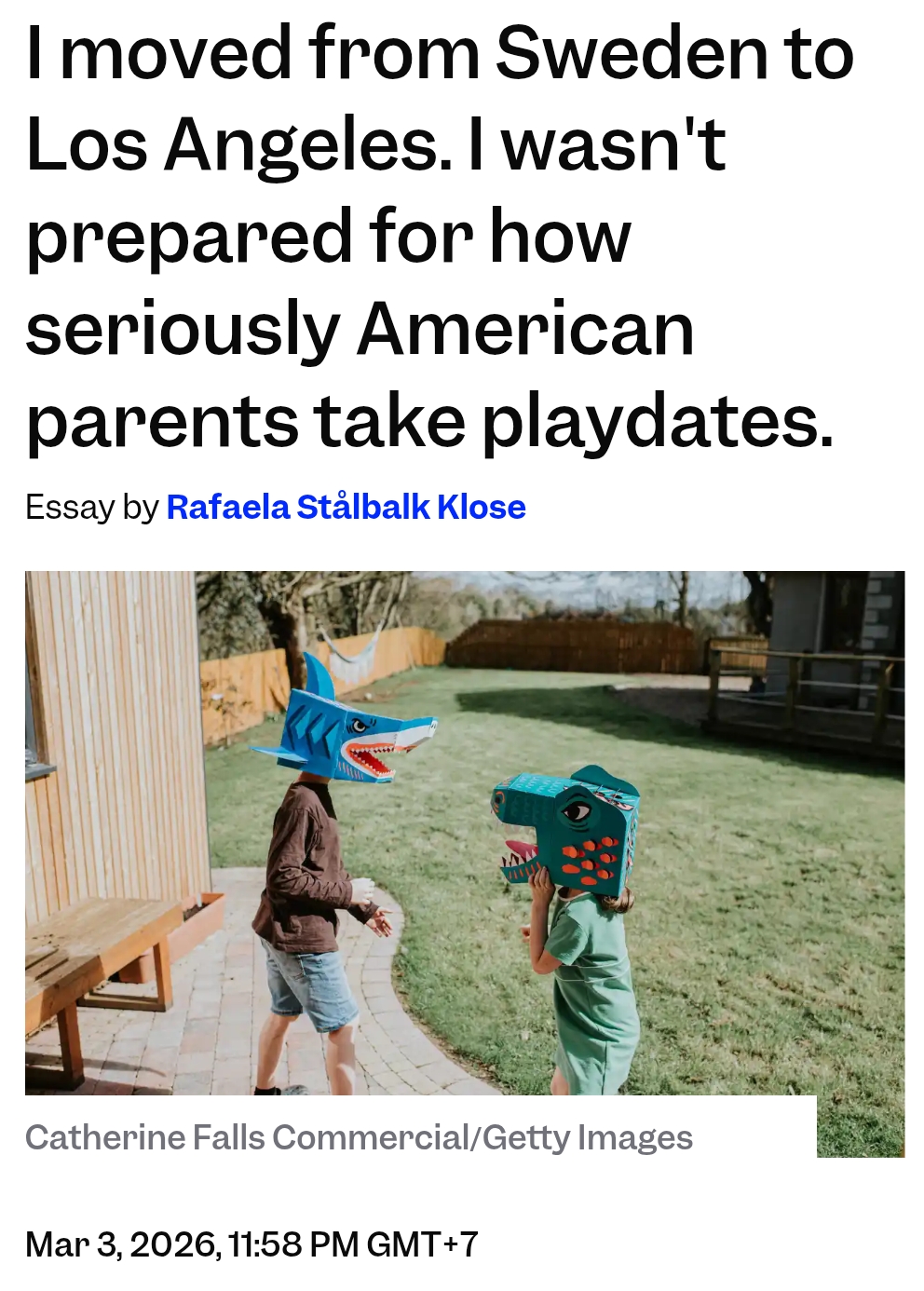 >I didn't expect American parents to stay for the entire playdate.>In Sweden, we drop kids off and trust them to sort things out.>In Los Angeles, I've learned trust builds extremely slowly, visit by visit.>This extends to parents, who also watch each other to make sure they are not inappropriately interacting with or looking at the children. Are Swedes too cold and careless with their kids?