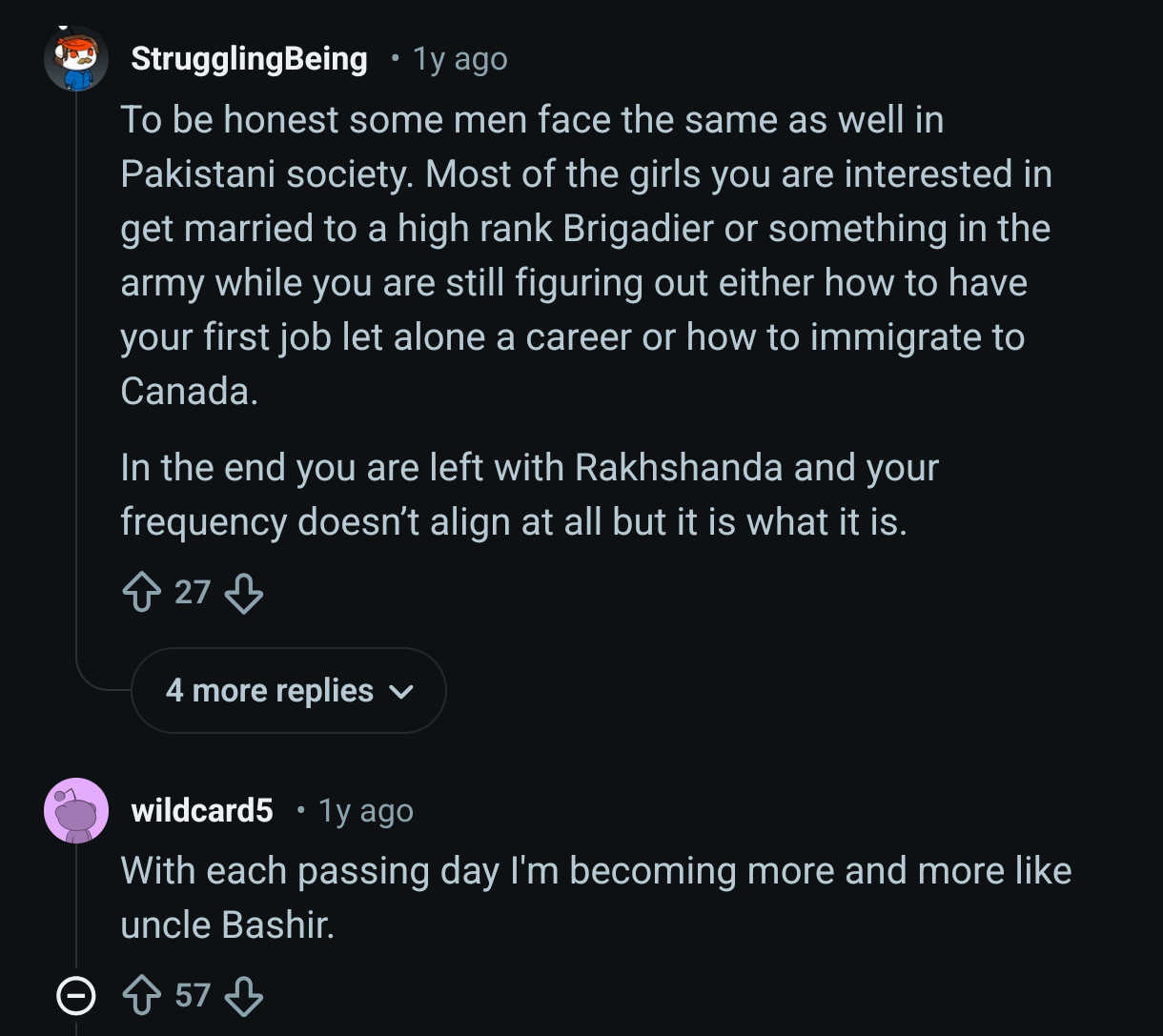 you can tell a post is Pakistani if they have memes about arranged marriage as if it was normal, or pictures of a dream luxury mansion with fancy cars but the rooms are labeled "our room", "parents room", "brothers room" "grandparents room", etc