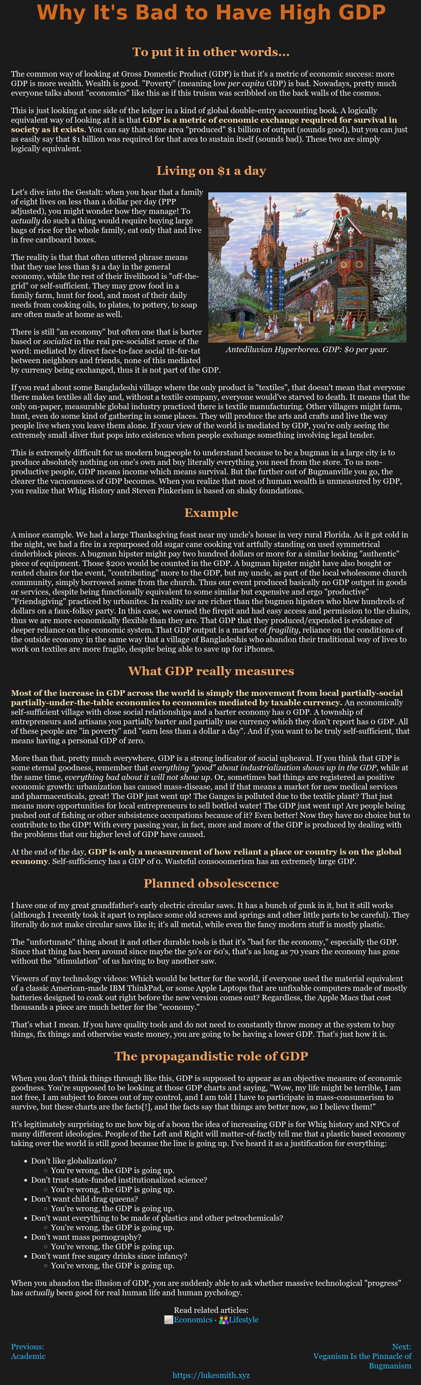 >>219817069Self-sufficiency is bad for the GDP.If you do not pay rent, aren't sick and medicated, and not paying bills all the time. you do not create demand for currency.