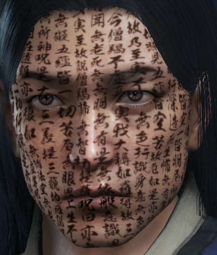 I have a few questions.1: Is there a name for when people paint their faces with kanji like this? Does this originate from the story of Hoichi the Earless, or does this phenomenon predate this story?2: Is the text written on this character's face from a sutra, or is it original? I've checked the string "実至故説僧" and it doesn't appear in any sutras I'm aware of, including the heart sutra or the lotus sutra.