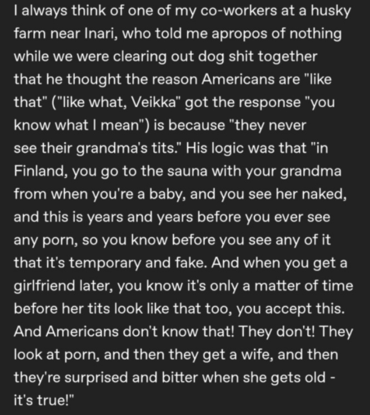 Finnish men don’t mind saggy tits because they saw their grandmas saggy tits in the sauna from a young age