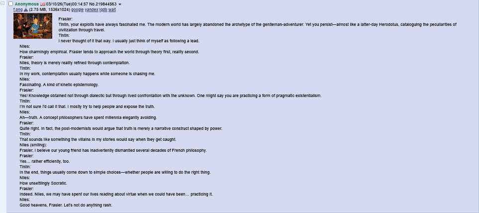 Frasier:Tintin, your exploits have always fascinated me. The modern world has largely abandoned the archetype of the gentleman-adventurer. Yet you persist—almost like a latter-day Herodotus, cataloguing the peculiarities of civilization through travel.Tintin:I never thought of it that way. I usually just think of myself as following a lead.Niles:How charmingly empirical. Frasier tends to approach the world through theory first, reality second.Frasier:Niles, theory is merely reality refined through contemplation.Tintin:In my work, contemplation usually happens while someone is chasing me.Niles:Fascinating. A kind of kinetic epistemology.Frasier:Yes! Knowledge obtained not through dialectic but through lived confrontation with the unknown. One might say you are practicing a form of pragmatic existentialism.Tintin:I'm not sure I'd call it that. I mostly try to help people and expose the truth.Niles:Ah—truth. A concept philosophers have spent millennia elegantly avoiding.Frasier:Quite right. In fact, the post-modernists would argue that truth is merely a narrative construct shaped by power.Tintin:That sounds like something the villains in my stories would say when they get caught.Niles (smiling):Frasier, I believe our young friend has inadvertently dismantled several decades of French philosophy.Frasier:Yes… rather efficiently, too.Tintin:In the end, things usually come down to simple choices—whether people are willing to do the right thing.Niles:How unsettlingly Socratic.Frasier:Indeed. Niles, we may have spent our lives reading about virtue when we could have been… practicing it.Niles:Good heavens, Frasier. Let's not do anything rash.