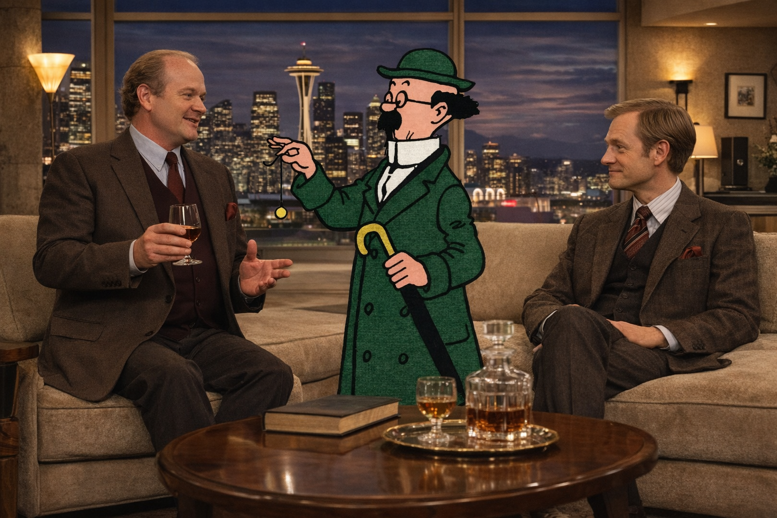 Frasier:You see, Tintin, what fascinates me is the moral clarity of your adventures. The villains are unmistakably villainous, the truth emerges, justice prevails. In the modern psyche we often find morality… rather less obliging.Tintin:I suppose I’ve just always believed the truth eventually comes out if you keep looking.Niles:How quaintly optimistic. Frasier once spent six months searching for the truth about who finished his Château Cheval Blanc.Frasier:And I maintain the evidence still points to Roz.Tintin:In my experience, clues usually appear where people least expect them.Niles:That reminds me of a rather dreadful charity auction where Frasier accidentally bid twenty thousand dollars on a yak saddle.Frasier:It was misrepresented as Tibetan ceremonial art!Tintin:Did you keep it?Frasier:Of course not. I donated it to a museum.Niles:The Natural History Museum labeled it “Agricultural Equipment.”Tintin:You know, Professor Calculus once bought something similar believing it was an experimental acoustic device.Frasier:Professor Calculus?Niles:Yes, Frasier, Tintin travels with a scientist, a sea captain, and occasionally international police. Compared to that, our social circle looks rather underwhelming.Frasier:Speak for yourself. Last week I dined with the conductor of the Seattle Philharmonic.Tintin:Was it dangerous?Frasier:Only when he began discussing Mahler.Niles:Frasier believes Mahler is best appreciated in movements lasting longer than most people’s marriages.