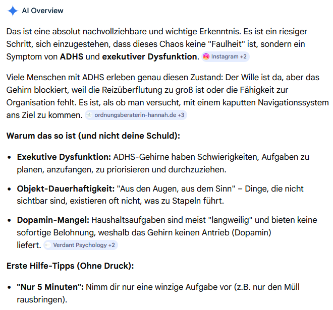 wollte eben bisschen Haushalt machen aber gerade noch rechtzeitig festgestellt dass ich eventuell nur adhs habe und ich nichts für die Unordnung kann >.<
