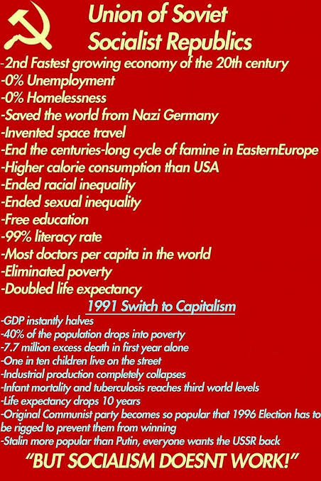 >>219943780Russia was the first country to implement communism, it had no model to follow and had to learn by trial and error, like Deng Xiaoping once said "to cross the river you must feel the rocks." But many communist leaders are famously impatient, they wanted the USSR and china to industrialize yesterday and caused famines, and they had to repress freedom of speech and get a monopoly of political power so the communist experiment wouldn't be snuffed out prematurely. The CCCP had many laudable qualities and it provided a good model for china to learn from.Russia should try socialism with Chinese characteristics.