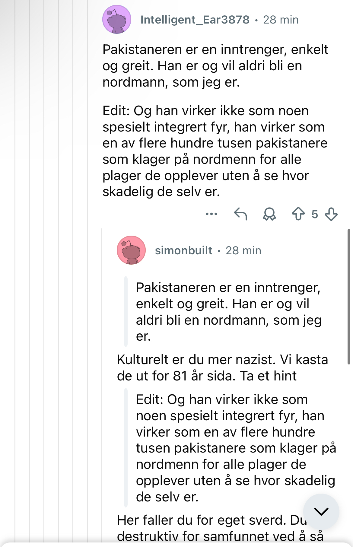 >>219915554Det der er på rnorske, tjøddusbroren til rnorge. Han som skrev at innvandring var landsforræderi ville vært permanent bannlyst etter 2 sekunder på rnorge