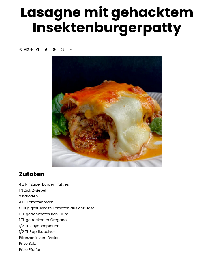 >>219925854>Dieses Mal bereite ich eine Lasagne mit einer Hackfleisch-Sauce zu, für die ich Insekten verwende. Am besten eignen sich hierfür Mehlwürmer, sie sind fleischig und schmecken nussig und eignen sich dazu, dass man sie kleinwiegt oder durch den Fleischwolf für Hackfleisch dreht. Die Sauce Bolognese schmeckt nach der Zubereitung wegen der Mehlwürmer wie gewohnt nussig-erdig.*KOTZ*