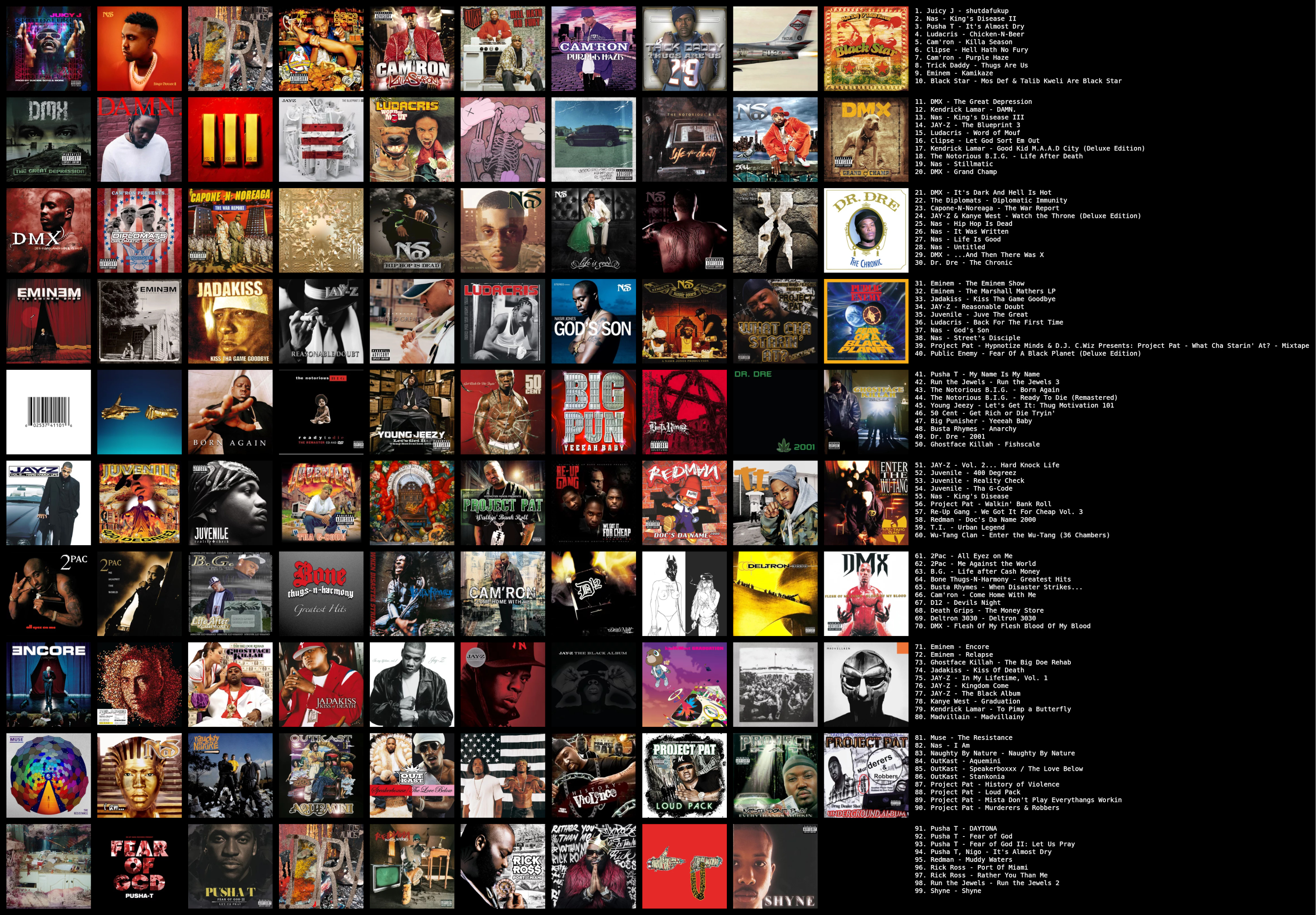 >>219926247the clipse/pusha t ones dontneither do kendricksnor death grips and deltron3030half of eminem's do thoughever