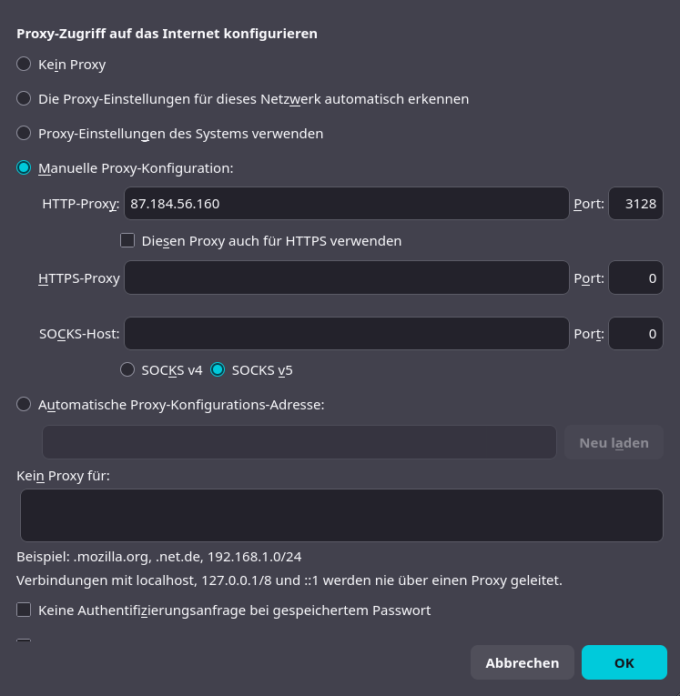 Könnt meinen Proxy gerne mal nutzen, wenn ihr wollt:IP: 87.184.56.160Port: 3128Protokoll: HTTPWenn ihr das eingerichtet habt, könnt ihr ja mal schauen, ob ihr https://server.clatcher erreichen könnt.Und nein, ich sehe eure IP nicht, die verwirft mein Proxy direkt wieder