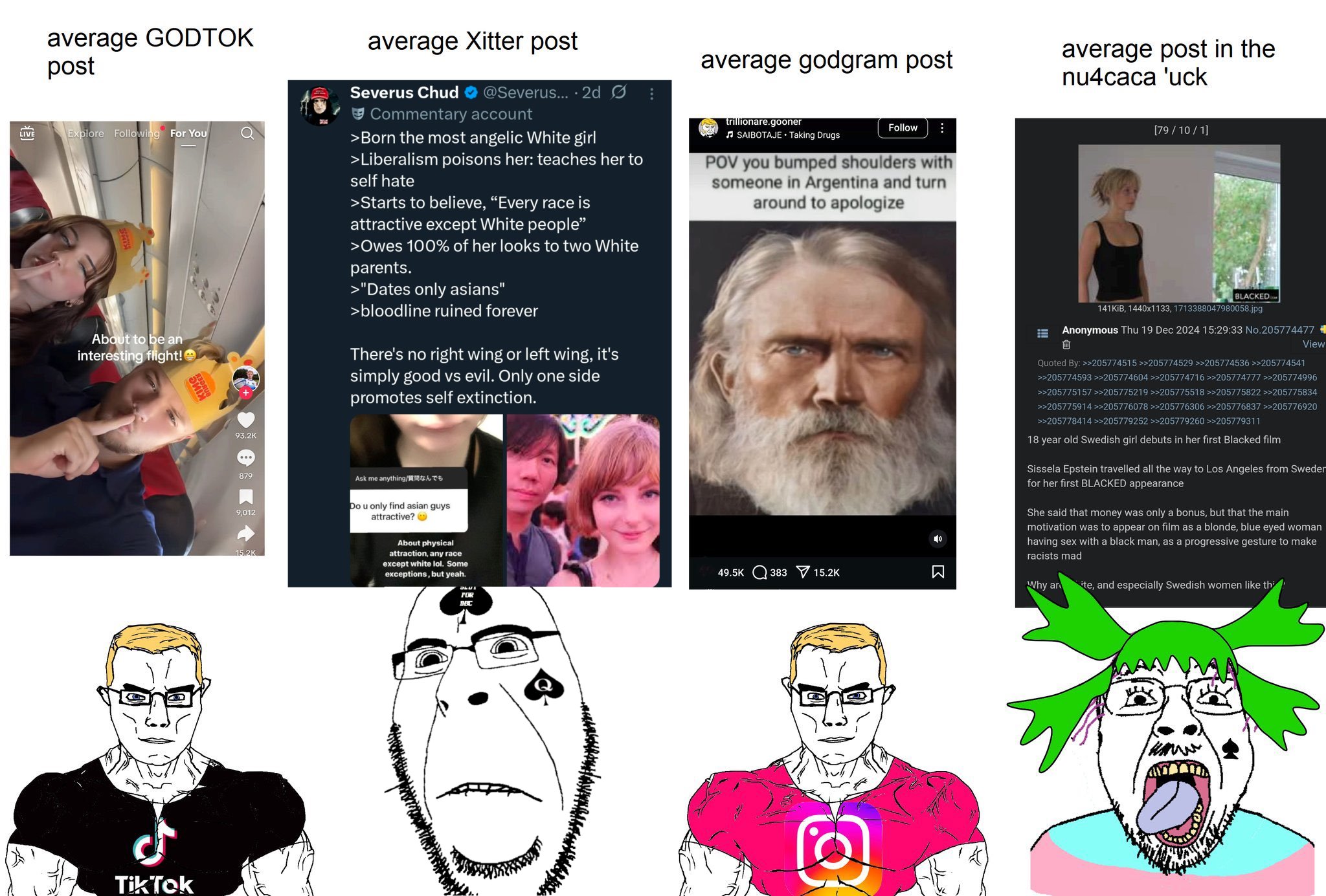 >>2199708554chan can't exactly market itself like other social networks can, disenfranchised chuds will find some private discord server or subreddit to sperg out on before hearing about 4chan through the grapevine. we will continue to accumulate the freaks that couldn't fit in anywhere else until everyone is sick of this place bar a few insufferable schizos