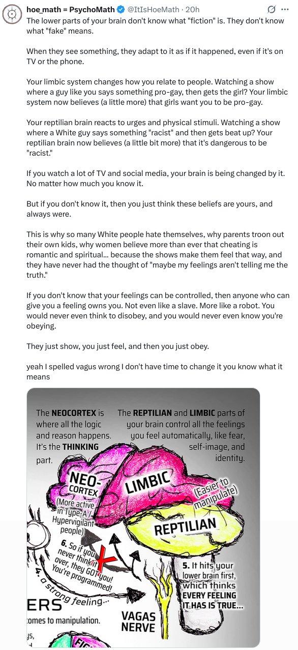 >>219965227havent used twitter in years, but its insane how badly the instagram/tiktok algorithms want you to consume right wing vids lol. i click not interested on them every single time and they will not stop showing it to me. if i like a video related to literally any interest (baseball, a tv show, a musician) it immediately shoves a bunch of right wing posts that are only slightly adjacent to that hobby. the ellisons and zuck have to be killed