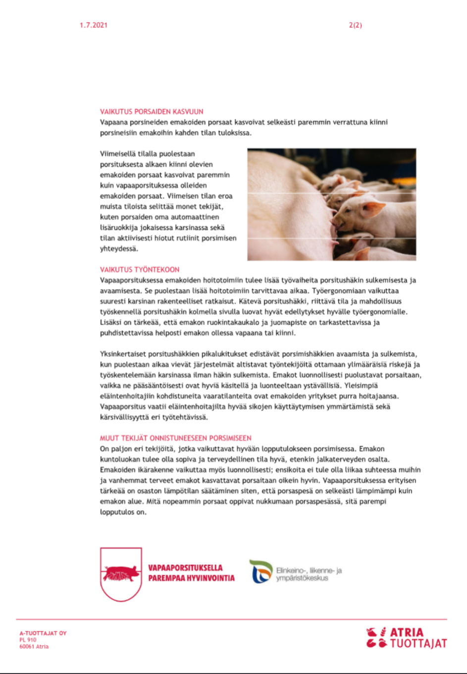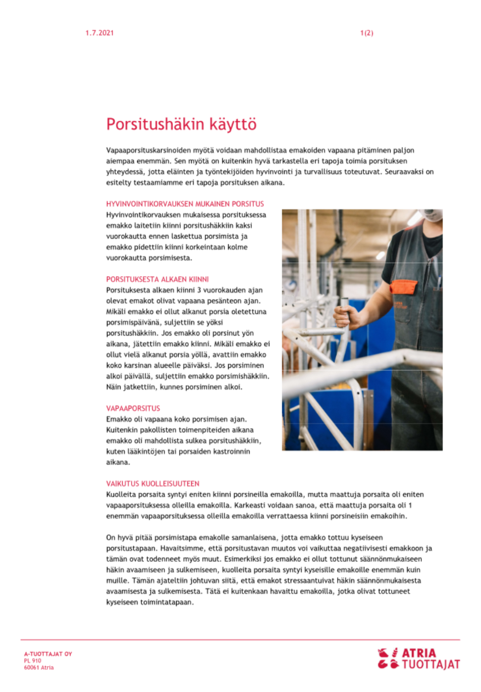 Snellmanin tavoitteena kohentaa sikojen hyvinvointia – vapaaporsitus korvaa häkitJo nyt 70 prosenttia sopimustilojen porsaista syntyy niin, että emakko hoitaa niitä vapaana. Snellman on asettanut tavoitteeksi, että kaikissa sen sopimussikaloissa emakot porsivat vapaasti vuonna 2028. Vapaaporsitustiloille on vuodesta 2019 maksettuun lisähintaa, jolla Snellman halua kannustaa tiloja siirtymään vapaaporsitukseen ja tukea siirtymän vaatimia investointeja.Tänä vuonna lisähintaa maksetaan kaikkiaan yli kaksi miljoonaa euroa.”Porsastuotannossa lisä on 10 euroa porsaalta, yhdistelmätuotannossa 10 senttiä kilolta.”Vapaaporsitus tarkoittaa, että emakko ei porsi häkissä vaan vapaana karsinassa, jossa sillä on tilaa liikkua ja hoitaa porsaitaan.Eläinten hyvinvointilaki ei täysin kiellä porsitustushäkkejä, mutta uusia ei saa rakentaa. Vahoja häkkejä saa korjata vain ylläpitotarkoituksessa.