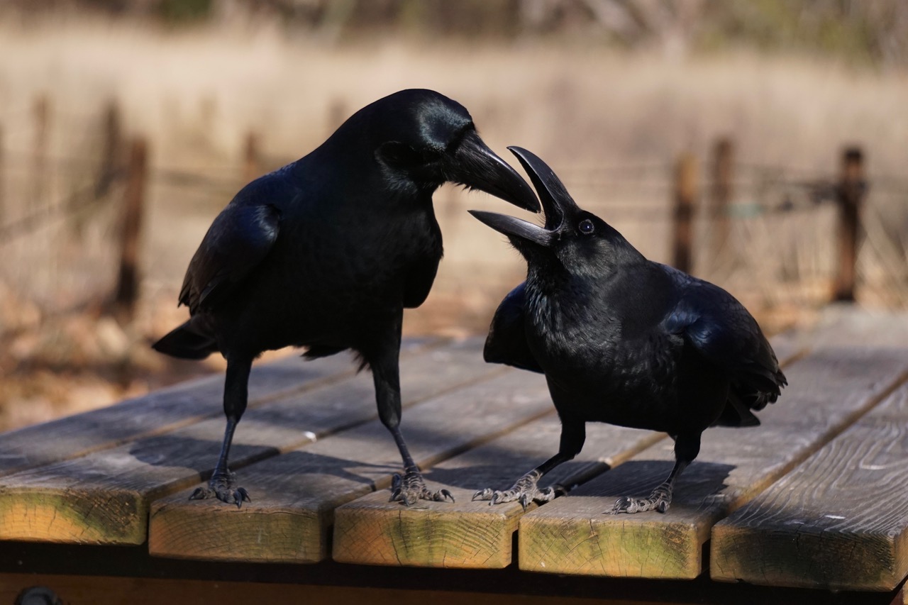 did you know that crows and other birds sometimes get drunk on fermented fruits? sweet little things. here's a crow smelling another crow's breath to check if he's been eating alcoholic fruits