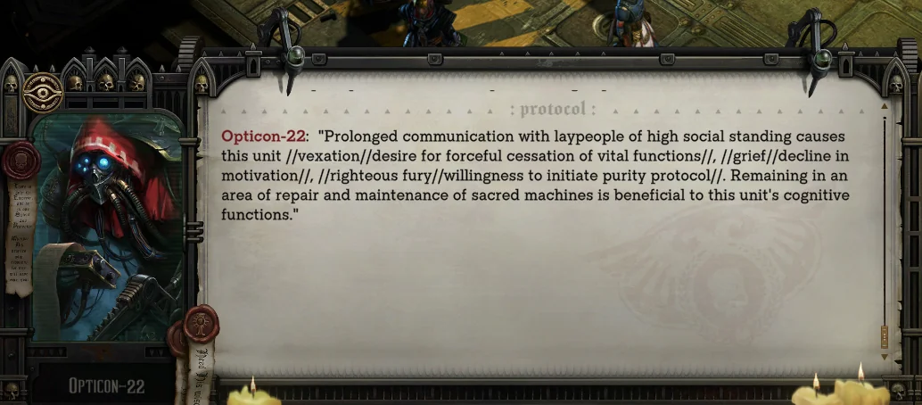 >>220010593Idira fell off hard for me over the course of Chapter 1. I liked her at first, but the more I interact with her, the more of a liability she seems.I don't know a lot about 40k lore, but I do know that you don't fuck around with warpshit (same reason I nuked the planet before it became a daemon world), so if she does that again, I'm flushing her out the airlock.