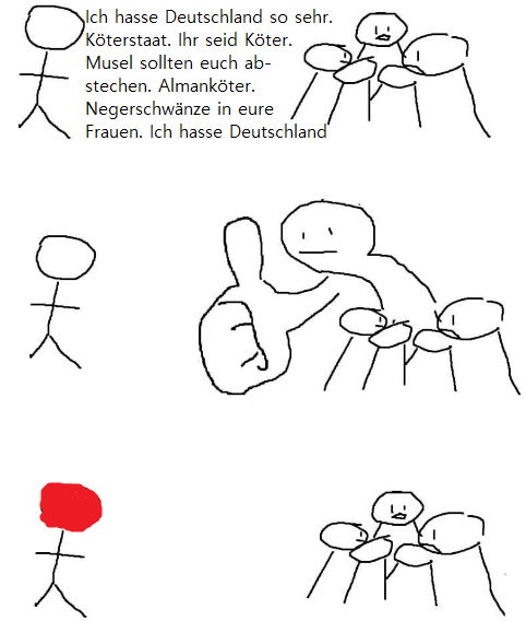 Ich glaube, ich hasse Deutschland? Alleine bei dem Gedanken an dieses Drecksland erleide ich Schweißausbrüche. Ich fange an zu zittern und bin nicht mehr in der Lage mich auf mein aktuelles Ziel zu konzentrieren. Es ist einfach so ein Drecksland. Alles hier ist scheiße. Die Menschen sind Hurensöhne. Selbst die Luft hier ist untermenschlich.