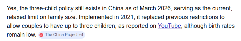 >>220031253>then claiming everyone else is lying?learn to read you idiothttps://en.wikipedia.org/wiki/Three-child_policyThe three-child policy (Chinese: 三孩政策; pinyin: Sānhái Zhèngcè), whereby a couple can have three children, is a family planning policy in the People's Republic of China that exists as a formality but is effectively abolished.