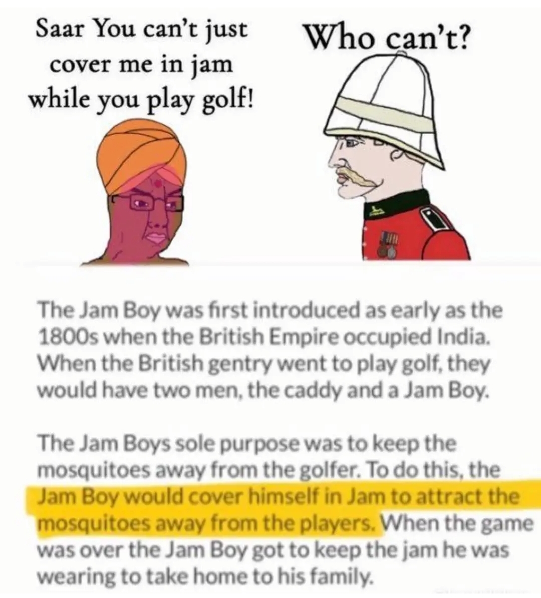 >>220108795>the jam boy got to keep the jam for his familyNever want to hear any more nonsense about the British being cruel to natives in the Empire days.
