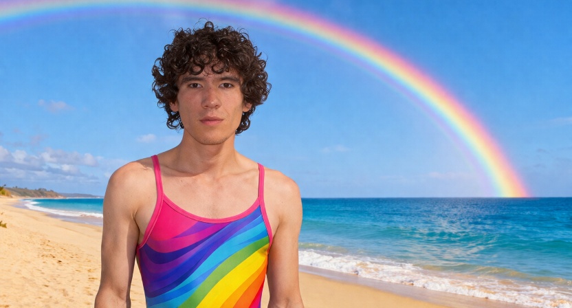Caneta está de maiô na praia agora