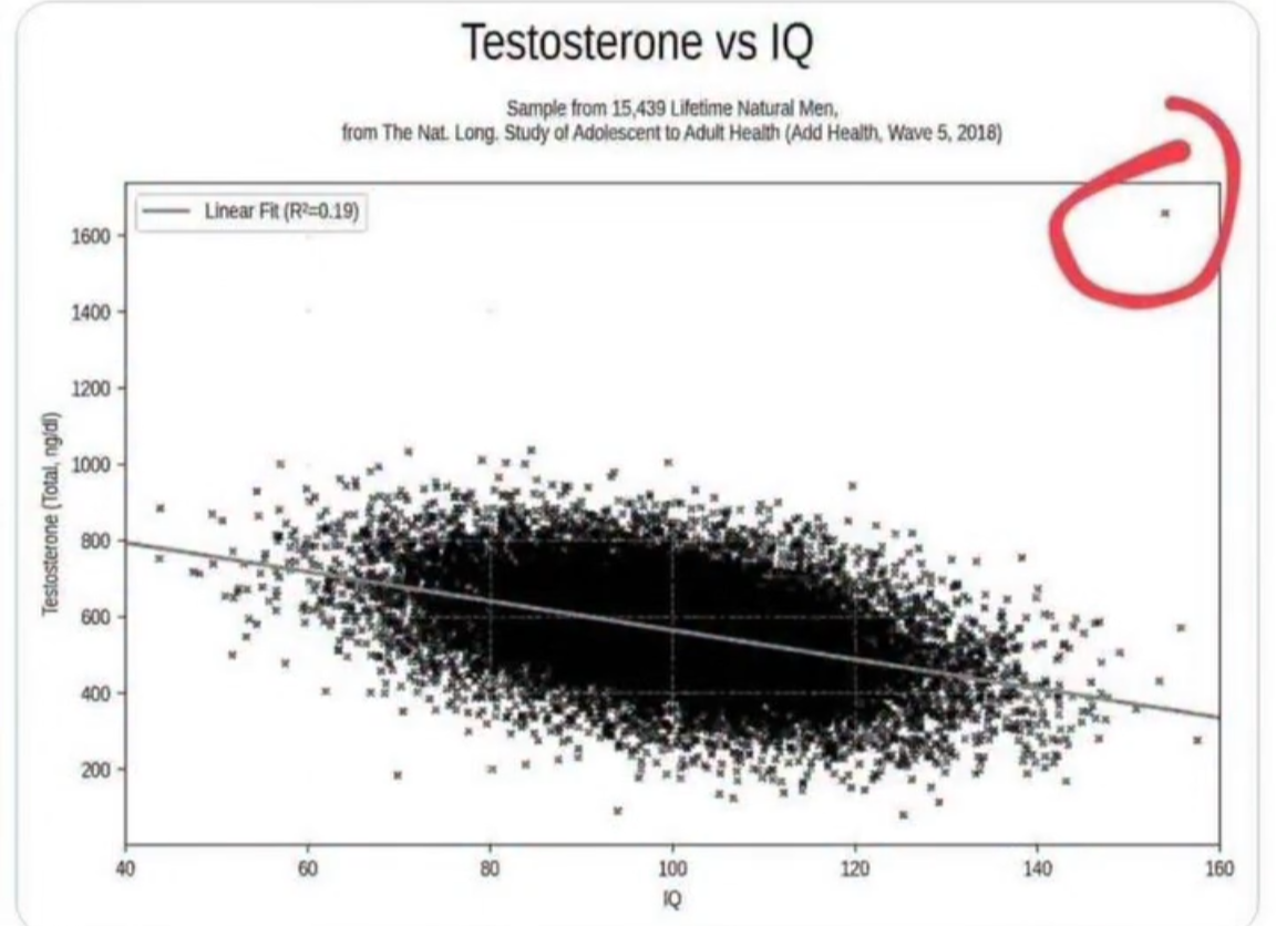 Here's another fun fact, higher IQ also correlates with lower testosterone. Except me, of course, I'm the top right circle.