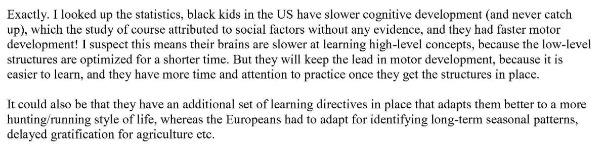 Epstein for example actually talked about gene editing blacks so that their brain development would be more European.
