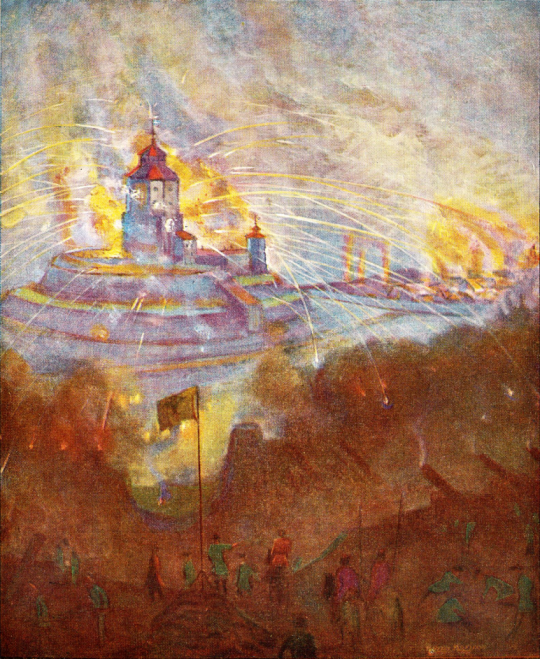 Venäläiset pommittavat Viipurin linnaa, Aarno Karimon historiamaalaus 1900-luvulta.